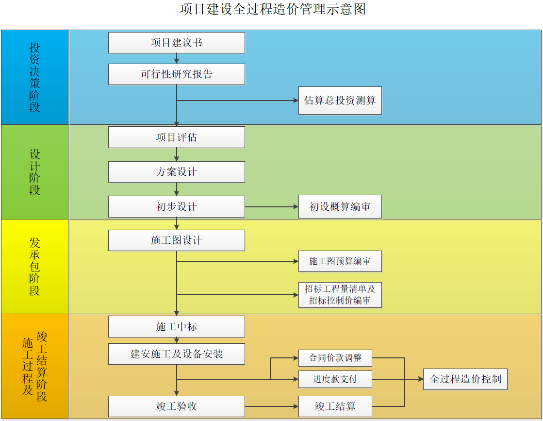 實踐中,建設工程全過程造價管理可以概括為貫穿于項目建設過程中的4個階段,分別為項目的決策階段、設計階段、發(fā)承包階段、施工過程以及竣工結算階段。